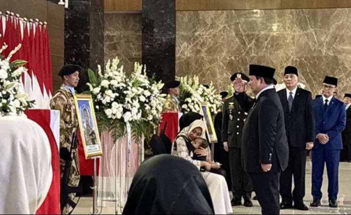 随后,普拉博沃总统、第六任总统苏西洛、国防部长沙夫里及多位国家官员共同目送载有三名国家优秀儿女遗体的灵柩被抬出,准备进行由陆军参谋长马鲁利·西曼君塔克上将主持的仪式流程。在仪式中,这三名国军士兵的遗体将正式移交,并由家属分别接回各自殡仪馆。(fd)