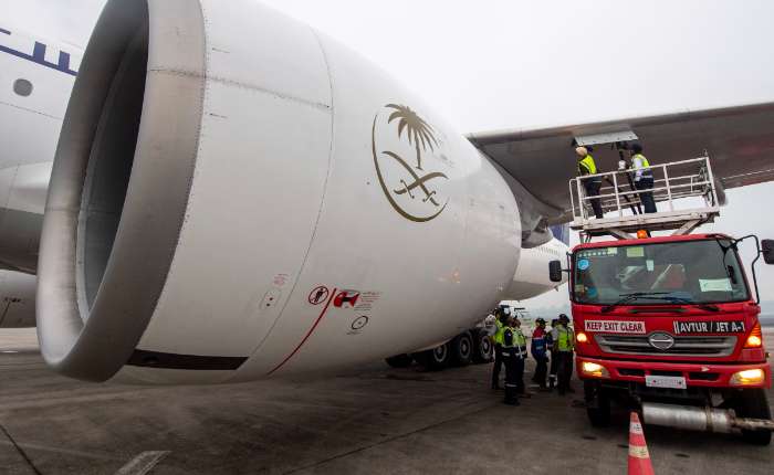 2026年4月23日,印尼巨港市苏丹马哈茂德·巴达鲁丁二世国际机场工作人员正在为沙特阿拉伯航空公司一架航班号为SV5103的波音777-31H飞机加注航空燃料。