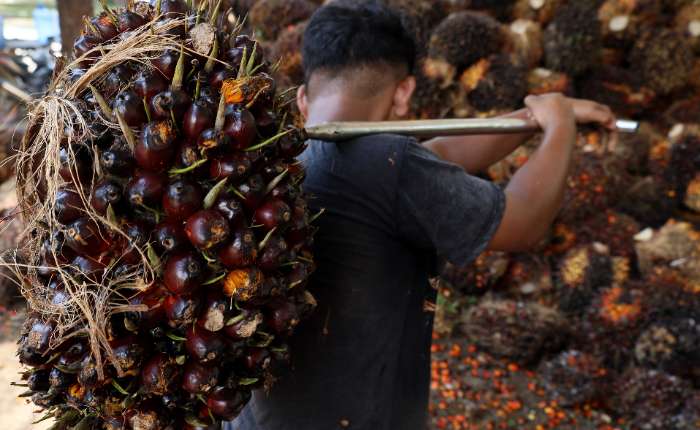 2025年9月26日,在西苏拉威西省中马穆朱县托波约(Topoyo),一名工人肩挑棕榈鲜果串(TBS)运往称重点。
