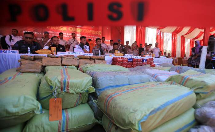 周一(10月6日),亚齐警局局长马尔祖基.阿里少将(Marzuki Ali Basyah,左四)与地方领导协调论坛成员在亚齐省班达亚齐市举行新闻发布会,就查获的毒品犯罪物证情况进行说明。(资料图)