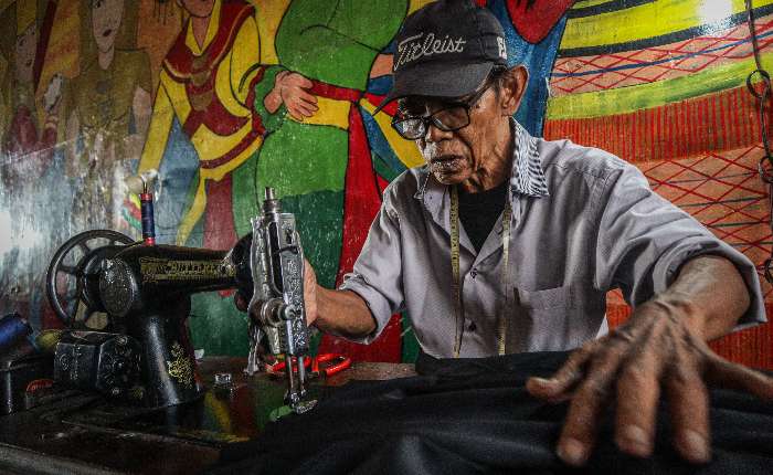 周三(10月8日),裁缝师在雅加达干冬墟(Jatinegara)镇Pisangan Lama路天桥下正在完成缝纫工作。