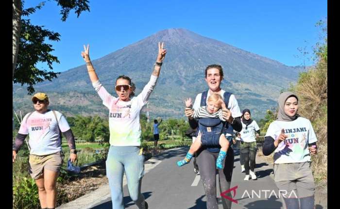 资料图:多名游客清晨在西努沙登加拉省龙目岛东龙目县森巴伦区稻田间晨跑,远处可见林贾尼火山(Rinjani)的壮丽景色。