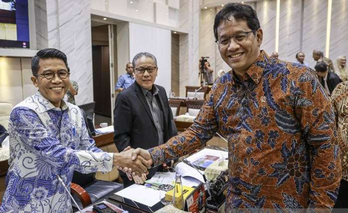 财政部长普尔巴亚(右)在雅加达史纳延议会大厦参加工作会议前与国会第十一委员会主席穆罕默德.米斯巴昆(左)握手。