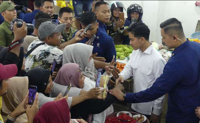 周二(10月14日),副总统吉布兰(右二)在马鲁古省安汶市马尔迪卡(Mardika)市场与当地居民握手。在工作访问期间,副总统吉布兰视察该市场的状况,并与居民和商贩进行对话,以听取他们的意见。(pl)