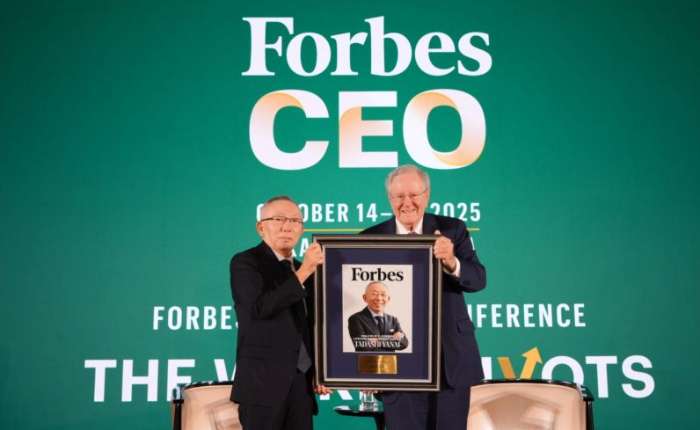 日本迅销集团董事长兼总裁柳井正(左)与《福布斯》传媒集团主席兼总编辑史蒂夫·福布斯(右)于2025年10月15日在雅加达出席《福布斯全球首席执行官大会》。
