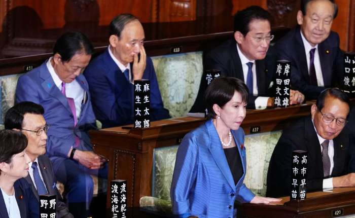 10月21日,日本自民党总裁高市早苗(前排右二)在东京参加临时国会众议院首相指名选举。 新华社记者 贾浩成 摄