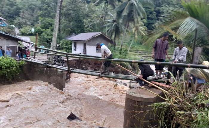 在西苏门答腊省索洛克县Kubung镇Koto Ilalang村因山洪暴发导致桥梁中断,当地居民正在搭建一座应急桥梁。