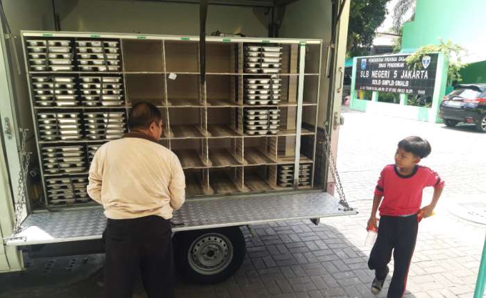 图为周五(11月28日),在雅加达,一名员工正配送免费营养餐。