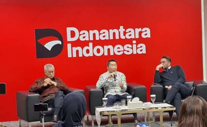 Danantara Indonesia 利益相关方管理董事 Rohan Hafas(左)与财资管理董事 Ali Setiawan(中)于2025年11月28日(周五)在雅加达举行的 “Media Lunch with Danantara Indonesia” 活动中出席并交流。