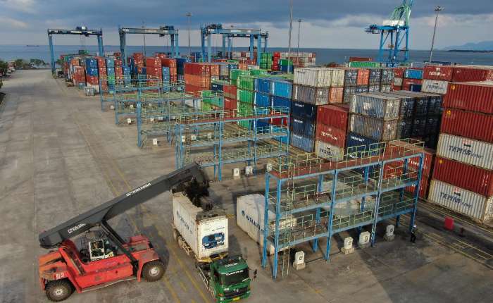 2025 年 11 月 4 日,无人机拍摄的东南苏拉威西省肯达里新港集装箱装卸作业场景。