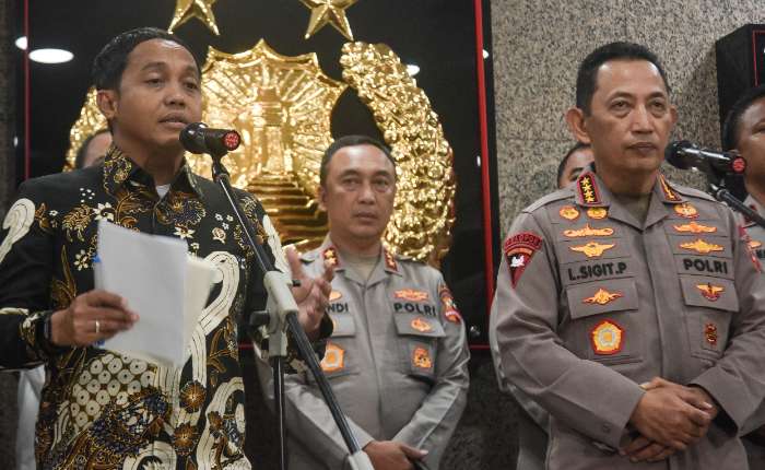 周四(12月4日),印尼林业部长拉贾.朱利.安东尼(Raja Juli Antoni,左)与国家警察总长利斯蒂约.西吉特.普拉博沃将军(Listyo Sigit Prabowo,右)在雅加达南区警察总部刑事调查局举行闭门会议后发表声明。