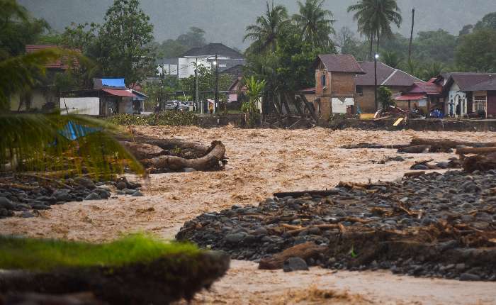 周二(12月30日),一些居民站在西苏门答腊省巴东(Padang)市阿帕村(Kampung Apa)的Batang Air Dingin河岸边。