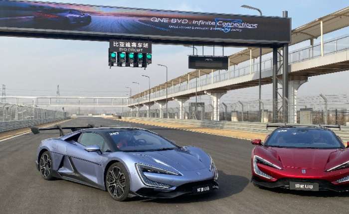 位于中国河南郑州比亚迪赛车场的两辆比亚迪仰望U9车型。