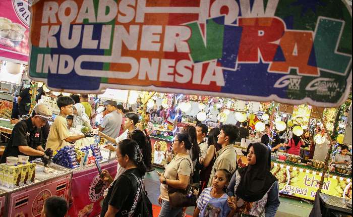 1月25日(星期日)在中加里曼丹省帕朗卡拉亚(Palangka Raya)市的多功能室内体育馆,一位摊贩正在为一名在摊位前点餐的来访者服务。此次印尼网红路边摊美食(roadshow kuliner viral Indonesia)在印尼多个城市举办,共有200家摊位提供超过1000种国际美食饮品,涵盖泰国、韩国、日本、意大利、马来西亚和印尼本土风味。该活动将持续至2026年2月4日。(pl)