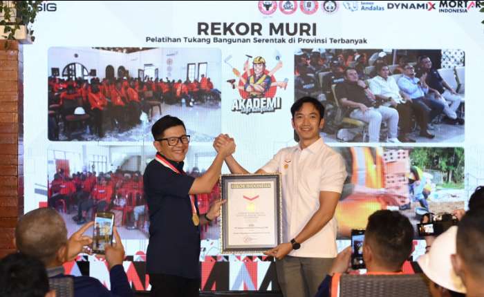 印尼水泥公司(PT Semen Indonesia Tbk,简称SIG)举办了一场建筑专家培训及认证活动,共有来自五个省份的500名学员同时参加。此次培训及认证活动由SIG与专业认证机构(LSP)合作举办,旨在提升建筑行业人力资源的专业能力,并因此在印尼世界纪录博物馆(MURI)创下纪录。图为周日(2月1日)在西爪哇省茂物县Sentul,SIG销售和市场总监Dicky Saelan(左)获得了印尼世界纪录博物馆颁发的证书。(商报/Max Manuhutu摄)