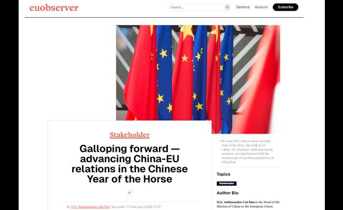 【中新网布鲁塞尔2月13日电】马年新春将至,中国驻欧盟使团团长蔡润11日在欧盟观察网等欧洲主流媒体发表署名文章,表示在2026年“万马奔腾”之年,中国迎来“十五五”规划开局,中欧关系也开启第二个五十年新征程。在新的起点上,中欧关系迎来新的机遇。