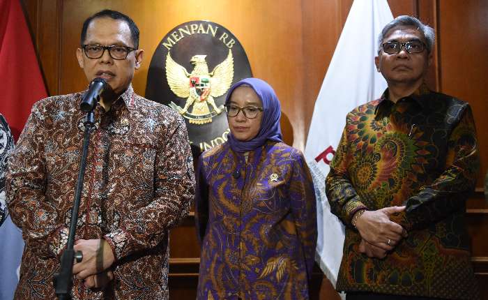 周二(2月24日),印尼肃贪委员会(KPK)副主席阿古斯.乔科.普拉莫诺(左)、国家行政和官僚改革部长丽妮.维迪安蒂尼(中),以及 KPK 主席塞蒂奥.布迪扬托(右)在雅加达国家行政和官僚改革部办公室就 2026 年第二学期国家预防腐败小组(Timnas PK)会议举行新闻发布会。此次闭门会议讨论了国家预防腐败战略(Stranas PK)的议程,其中包括提交 2026 年第二学期报告、与免费营养餐(MBG)计划和乡村红色合作社相关的拟议行动计划,以及关于修订 2018 年第 54 号政府条例关于国家预防腐败战略的计划。