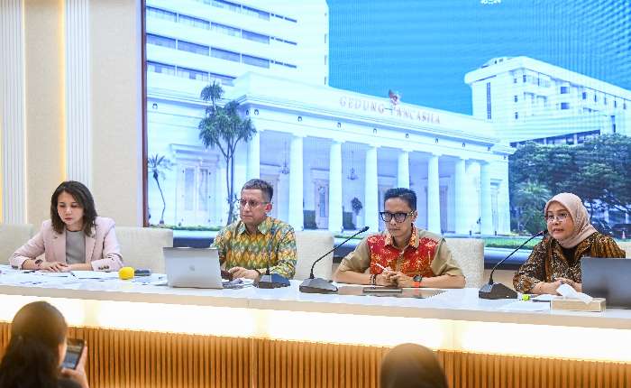 印尼外交部公民保护代理主任海妮.哈米达(Heni Hamidah,右)、外交部发言人伊冯娜.梅文康(Yvonne Mewengkang,左)、瓦赫德.纳比尔.艾哈迈德.穆拉切拉(Vahd Nabyl Achmad Mulachela左二),以及外交部新闻与媒体主任哈尔迪奥.哈尔科莫约(Hartyo Harkomoyo,右二)于3月13日(星期五)在雅加达外交部举行的新闻发布会上发表声明。