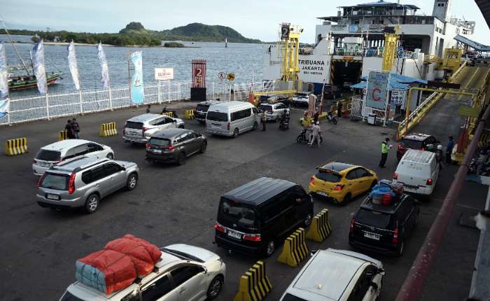 周一(3月23日),楠榜省南楠榜县Bakauheni港,车辆排队等待进入渡轮。根据ASDP公司Bakauheni分公司的数据,在开斋节后第二天的返程高峰中,共有51,751名旅客、5,248辆两轮机动车及7,407辆四轮机动车经此渡海前往万丹省Merak港。