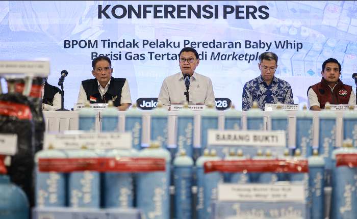 印尼食品药品监管局(BPOM)局长Taruna Ikrar(左二)在BPOM执法副代表Tubagus Ade Hidayat(左)、BPOM药品、麻醉品、精神药物、前体及成瘾物质监管副代表William Adi Teja(右二),以及国家警察刑事调查局毒品犯罪处代表Kelana Jaya警监(右)的陪同下,于周四(4月9日)在雅加达BPOM办公室举行的新闻发布会上,就查处医用一氧化二氮(N2O)/笑气产品的执法行动发表声明。BPOM联合警方在西雅加达地区打击了非法流通的“Baby Whip”品牌一氧化二氮气体,查获的物证包括:51个2.2升装Baby Whip N2O、5个空的2.2升Baby Whip N2O气罐,以及3箱用于辅助使用Baby Whip的喷嘴。
