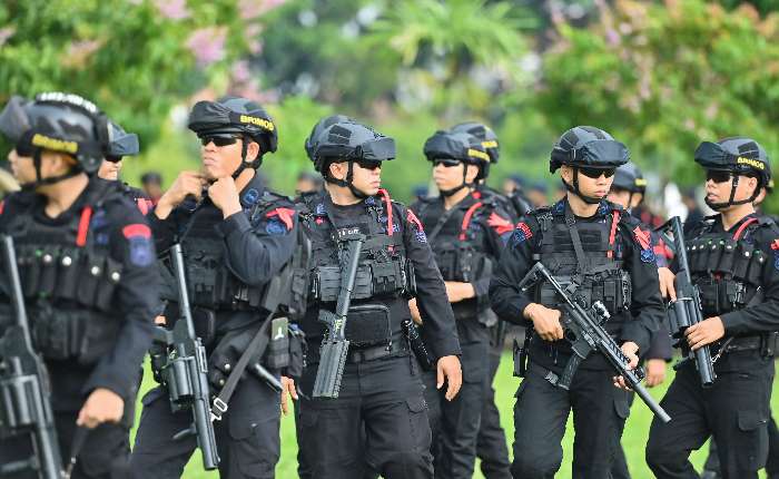 周五(12月19日),巴厘岛警察机动旅(Brimob)多名成员参加在巴厘岛登巴萨举行的“2025年烛光行动(Operasi Lilin Agung 2025)”部队集合点名活动。
