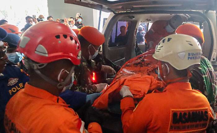 周五(4月17日),联合搜救人员在西加里曼丹省坤甸的安东.苏贾尔沃(Anton Soedjarwo)警察医院,将一架注册号为PK-CFX的空客H130型直升机事故遇难者遗体从运抵车辆上抬下。联合搜救队于周四(4月16日)在西加里曼丹省Sekadau县Bukit Puntak,成功疏散了这起直升机事故中的八名遇难者遗体,随后将其送往警察医院的法医鉴定机构进行进一步身份识别。
