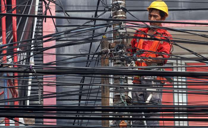 2025年9月17日,西爪哇省德博市一名工作人员正在维修电网。