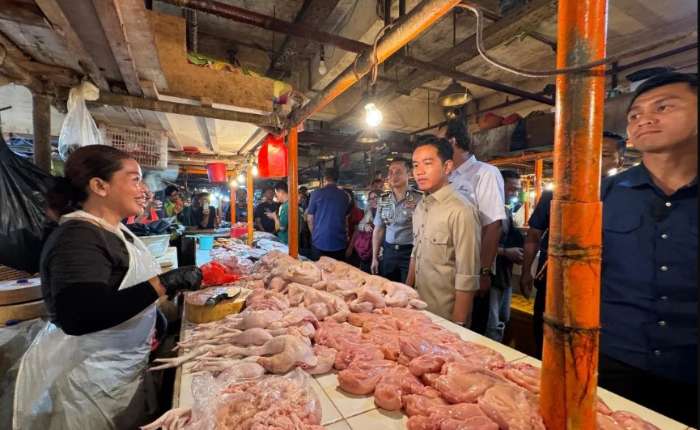 副总统吉布兰周二(9月30日)在雅加达老巴刹传统市场与一名鸡肉商贩交谈。