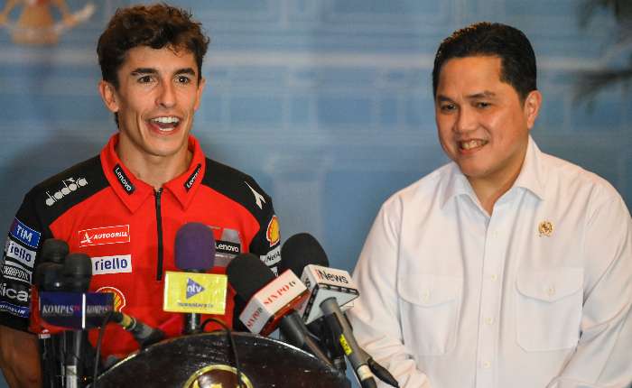 西班牙籍MotoGP赛车手马克.马奎斯(Marc Marquez)与体育部长埃里克.托希尔(Erick Thohir)于周二(9月30日)在雅加达总统府拜见普拉博沃总统后共同召开新闻发布会。