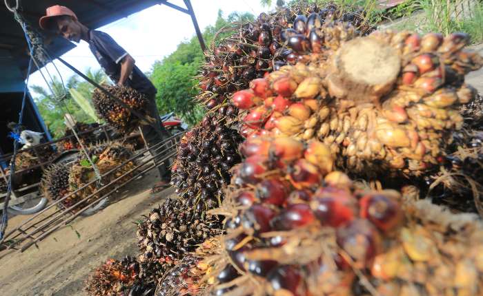 2025年9月23日,在亚齐省西亚齐县Suak Raya村,一名农户在自家棕榈园里称量刚采收的鲜果串。
