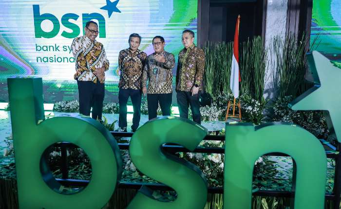 图为:国家夏利亚银行(Bank Syariah Nasional,BSN)总裁 Alex Sofjan Noor(右二)在国家夏利亚银行名称与标志启用仪式上,与印尼国家储蓄银行(BTN)总裁 Nixon LP Napitupulu(左二)、副总裁 Oni Febriarto Rahardjo(右一)及BSN监事长Bahrullah Akbar(左一)交谈。启用仪式于2025年10月2日(周四)在雅加达举行。此举是对金融服务管理局(OJK)于2025年9月24日发布批复的落实,允许此前名为维多利亚夏利亚银行(Bank Victoria Syariah)的机构更名为国家夏利亚银行,并以夏利亚商业银行身份运营。