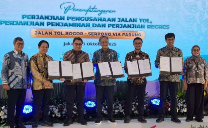 10月3日,公共工程部长多迪·杭戈多(中)在雅加达出席茂物—色邦经帕龙高速公路特许经营协议、担保协议及追索协议签署仪式。