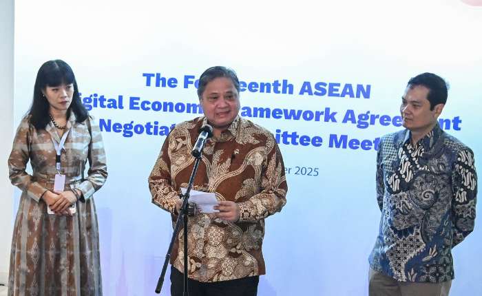 2025年10月7日,印尼经济统筹部长艾尔朗卡(中)与《东盟数字经济框架协议》谈判委员会联合主席普雷普拉·春拉姆(左)、东盟秘书处市场一体化局局长黎光兰(右)在雅加达举行的第十四轮谈判委员会会议期间共同出席新闻发布会。