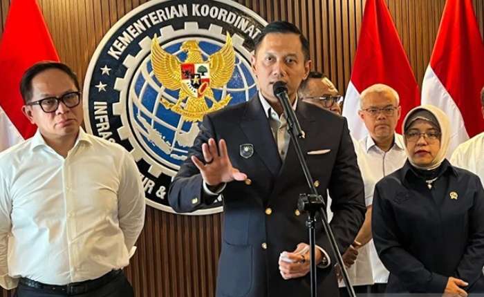 基础设施和区域发展统筹部长阿古斯•哈里穆尔蒂•尤多约诺(AHY)在雅加达主持关于处理ODOL国家行动计划实施的部长级协调会议后向媒体发表声明。