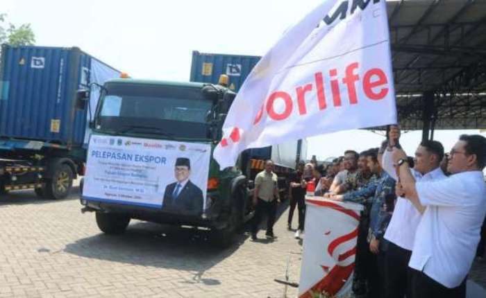 2025年10月3日,周五,贸易部长Budi Santoso(右)在东爪哇省安褥(Nganjuk)启动Moorlife产品出口项目。