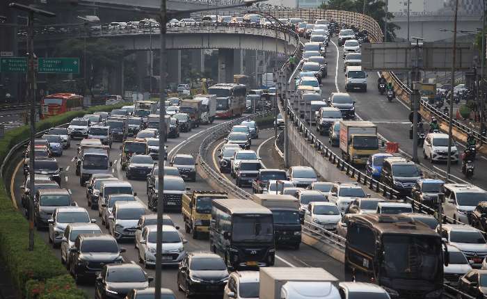 根据荷兰导航技术公司通腾(TomTom)的数据显示,雅加达在印尼国拥堵城市排名中位列第五,全球排名从2023年的第30位显著改善至2024年的第90位,这得益于公共交通设施的提升。图为周三(10月8日),正在穿越雅加达Gatot Subroto路及市内收费公路的车辆。