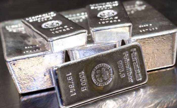 德国贵金属交易商Pro Aurum桌子上的保险箱里摆放着各种尺寸的银条。