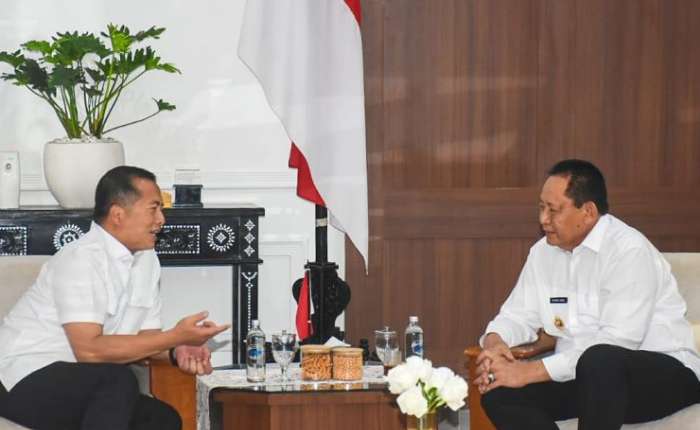2025年10月13日,西努沙登加拉省省长拉鲁·穆罕默德·伊克巴尔(左)与哥伦打洛省省长古斯纳尔·伊斯迈尔(右)在西努沙登加拉省马塔兰市省政府办公区的省长官邸内,就民间采矿管理事宜进行交流。
