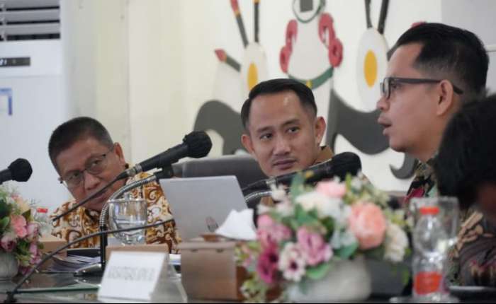 中加里曼丹省帕朗卡.拉亚市长Fairid Naparin(中)在地方议会主席Subandi(左)的陪同下,与KPK就地方政府治理改进事宜举行协调、监督与评估会议。