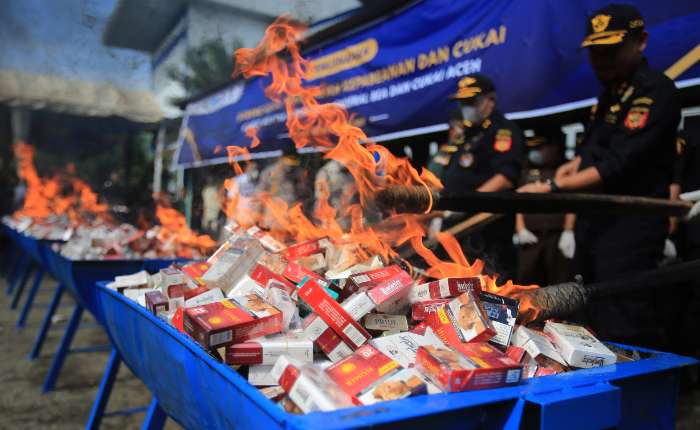 周三(10月22日),海关官员在班达亚齐举行新闻发布会后,销毁非法进口香烟。