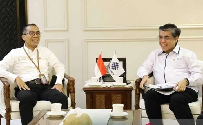 高等教育、科学和技术部长布莱恩•尤利亚尔托(左)与劳工部长亚瑟尔利(右)在雅加达南区劳工部办公室举行会晤。