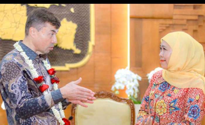 【本报讯】东爪哇省长科菲法.因达尔.帕拉万萨(Khofifah Indar Parawansa)在泗水格拉哈迪(Grahadi)国家大厦接待俄罗斯联邦驻印尼大使谢尔盖.托尔琴诺夫(Sergei Tolchenov)来访,双方探讨在海事与教育领域的战略合作。