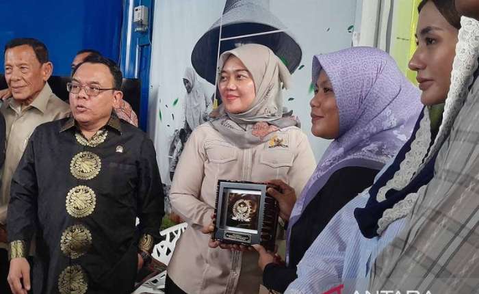 国会第七委员会副主席楚丝努妮雅(Chusnunia Chalim,中)于10月23日在班达亚齐(Banda Aceh)向中小微企业从业者赠送纪念品。
