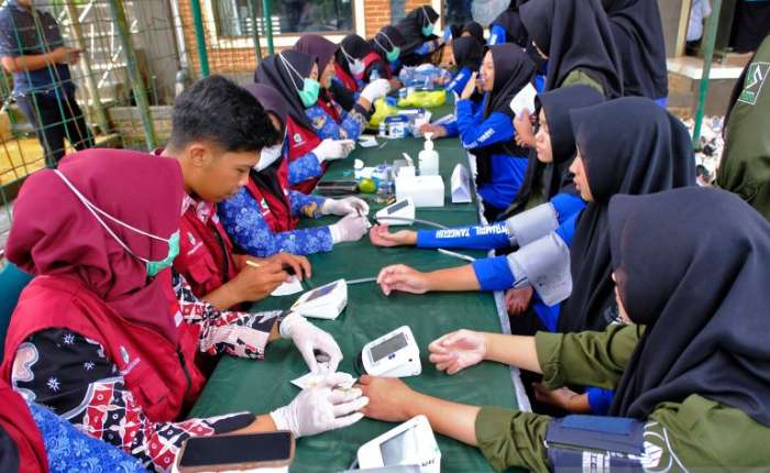 周二(10月28日),中爪哇省淡满光(Temanggung)县德加尔萨里(Tegalsari)村Nida' Al-Qur'an Paladan 伊斯兰寄宿学校开展免费健康检查服务,医护人员正在为多名学生测量血压。