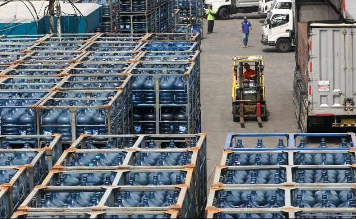 雅加达某分销点的工作人员正在装卸Aqua品牌的瓶装饮用水。