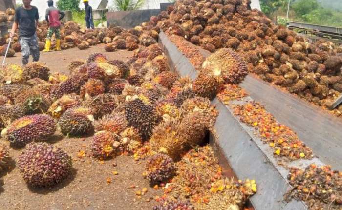 工人在西南亚齐县一家棕榈油加工厂内堆放新鲜棕榈果串。(2025年10月14日摄)