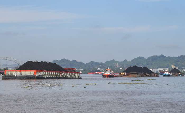 运载煤炭的驳船行驶在东加里曼丹省三马林达市的马哈坎河上。(2025年7月13日摄)