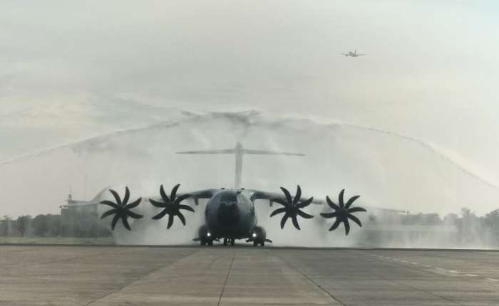 【本报讯】印尼空军(TNI AU)拥有的最大运输机--空客A400M于周一(11月3日)清晨降落在雅加达哈林(Halim Perdanakusumah)空军基地,并接受了印尼空军传统的洒水迎接仪式。