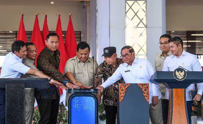 普拉博沃•苏比安托总统(左4)在基础设施与区域发展统筹部长阿古斯•哈里穆尔蒂•尤多约诺(左3)、国务秘书部长普拉塞蒂奥•哈迪(左2)、交通部长杜迪•普尔瓦甘迪(右4)、政府通信局长安加•拉卡•普拉博沃(右2)、内阁秘书泰迪•因德拉•维贾亚(右1)、雅加达首都特区省长普拉莫诺•阿农(右3)、印尼铁路公司总裁博比•拉斯迪丁(左1)的陪同下,为雅加达新丹拿旺车站主持启用仪式。
