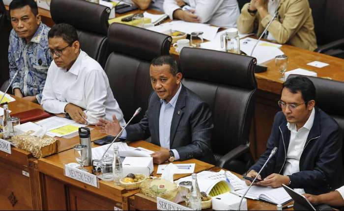 11月11日,能源与矿产资源部长巴赫利尔·拉哈达利亚(右二)与副部长尤里奥特·丹绒(左二)在雅加达国会大厦出席与国会第十二委员会的工作会议并作报告。